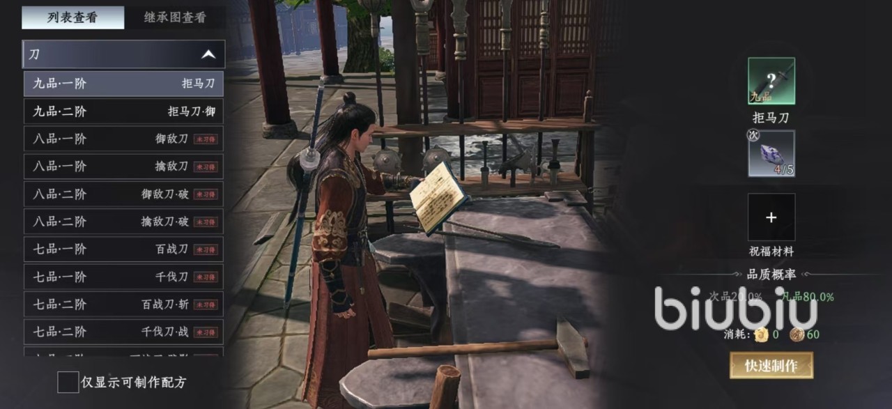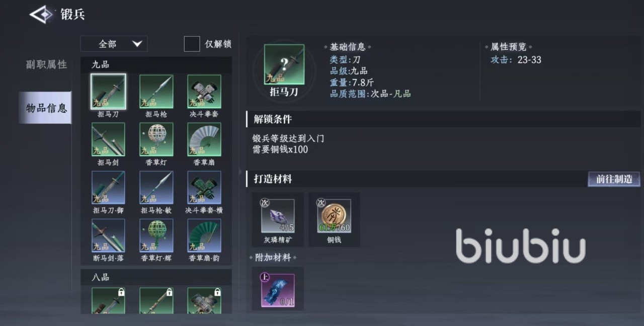 锻造需要消耗对应的矿石、铜钱和附加材料。例如最基础的九品绿色武器,需要消耗灰磷精矿和铜钱,如果能够添加秘文等附加材料,那么就可以提高获得高品质武器的几率。往上还有8品和7品以及6品,品级越高,需要消耗的材料也就越多。大家可以在副职业中直接查看到需要哪些材料,收集完毕之后,直接前往武器制作台打造就可以。