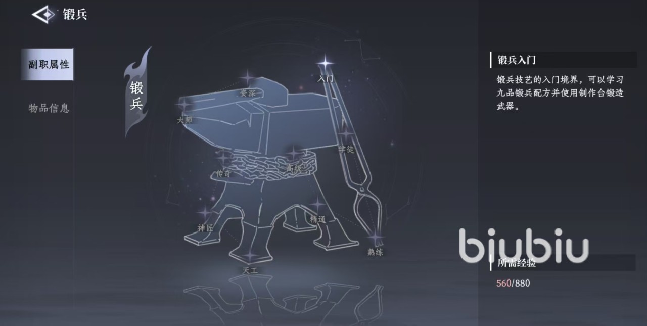 探索副本很好理解,在游戏中的很多高难度活动都会掉落装备,而且会根据当前玩家的等级掉落不同品级的装备。在探索宝箱方面,很多玩家在开宝箱的时候,如果运气好也可以开出一些装备,但几率比较低,而且开出的品级也不会太高,只能够满足前期的基本需要。所以目前最重要也是最稳定的,就是通过副职业打造来获得。副职业分为两类,其中打造武器就是属于锻造中的锻兵。锻兵从入门开始一直到最后的天工,需要大家不断累积才可以提升等级,等级提升之后,就可以锻造品级更高的装备。