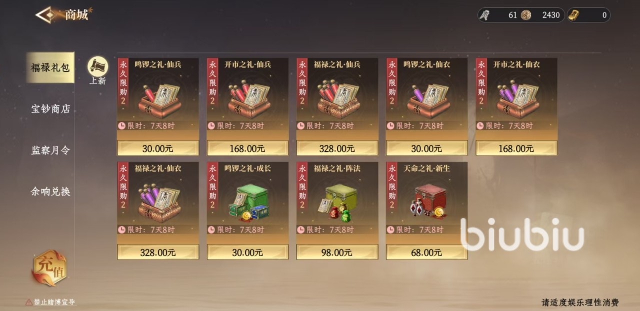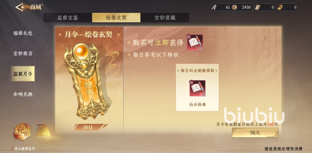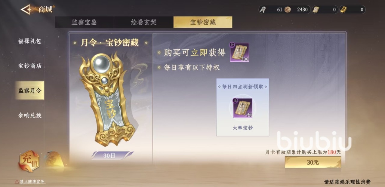 大家进入游戏中之后点击商城,然后选择监察月令,这样就可以选择购买三种不同的月令,也就是大家所说的月卡,分别是月令监察宝鉴,月令绘卷玄契,月令宝钞密藏。这三种的价格有所不同,第1种监察宝鉴,有7日和30日这两种规格,7日需要8元,30日需要30元钱。绘卷玄契只有30日这一种,需要98元,宝钞密藏也只有30日,需要30元。