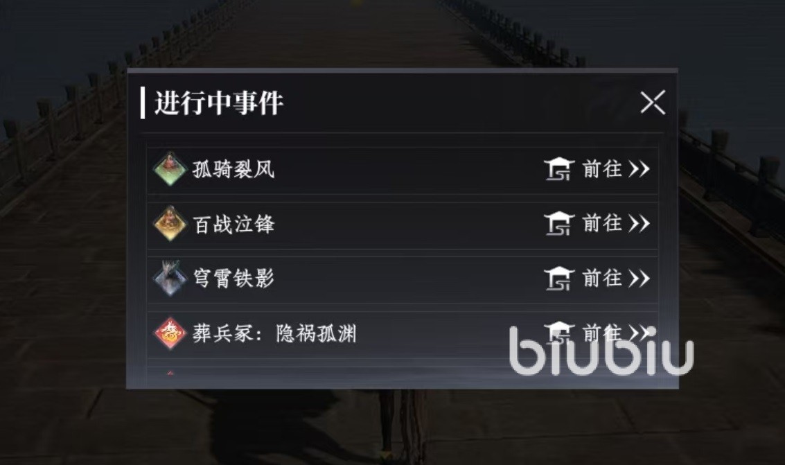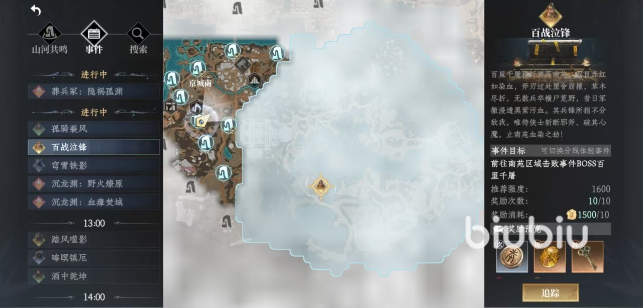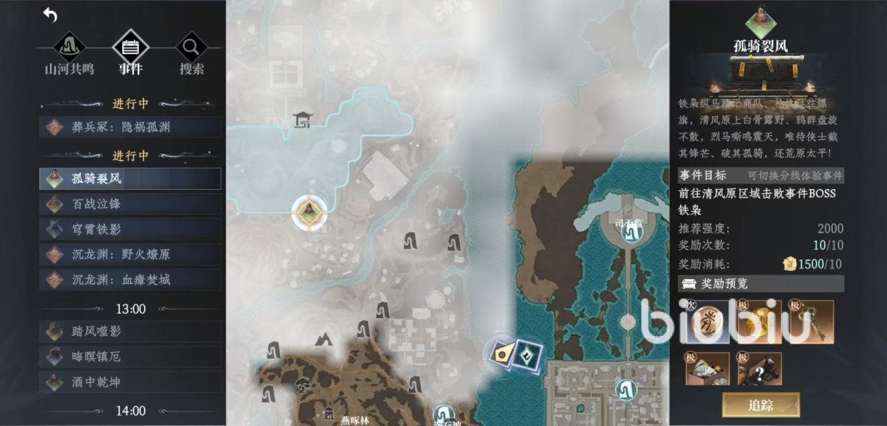 例如在每天12点开放的是孤骑裂风、百战泣锋、穹霄铁影。孤骑裂风是需要大家去清风原区域击败boss铁枭,百战泣锋是去南苑区域击败boss百里千屠,穹霄铁影是去桐影区击败BOSS铁羽王。到了13点,开放的世界首领就变成了踏风噬影、晦暝镇厄和酒中乾坤。踏风噬影是去南苑区域击败BOSS猲狙,晦暝镇厄是去平荫镇击败BOSS暗灵寿君,酒中乾坤是去怀阳林区击败BOSS酒公。