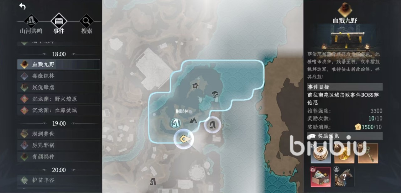 后续14:00 、15:00等,都有对应的事件触发,他们在地图的不同区域,大家可以根据提示直接去对应的地点进行战斗。在地图中查看的时候,不仅会指明它们的位置,还有推荐强度以及掉落的奖励预览,因为每天的奖励次数是有限的,所以不可能全部参与,这样大家根据自己的强度和奖励需求去有选择的进行战斗就可以。为了能够第一时间抢到boss,大家一定要尽量多开放传送点,这样boss出现后直接就可以传送过去。