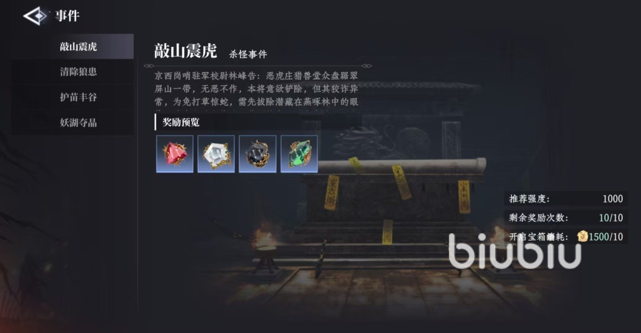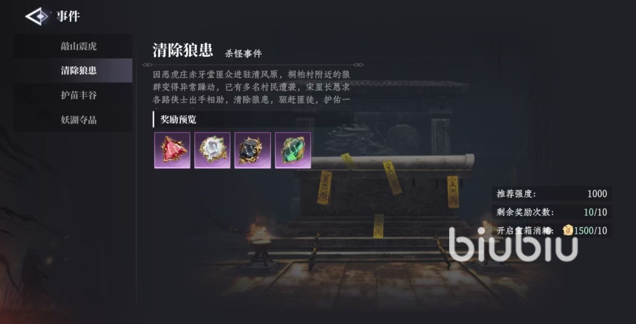随着玩家不断往前推进剧情,可以触发更多的事件,具体当前可以去挑战的有哪些,大家可以打开江湖手册,然后选择其中的风云考,在这里就可以看到事件选项。点击前往就可以查看当前所能完成的具体事件。事件分为很多种,主要包括杀怪事件和采集事件等,其中杀怪事件要求的强度比较高,采集事件要求的强度比较低。杀怪事件大多数都需要去进行战斗,而采集事件只需要付出一定的时间就可以完成。