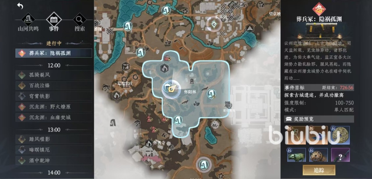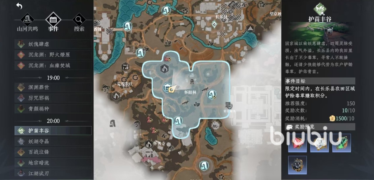 玩家还可以通过点击小地图,然后在大地图中可以看到有事件选项,切换到事件之后,就可以看到当前所能进行的事件类型,以及它们所对应的地址。大世界中的事件就更加丰富了,而且是按照时间来进行分类,不同时间有不同的事件触发。大家按照时间节点寻找到自己所需要的去进行战斗或其他操作就可以。在这里同样可以浏览当前的强度推荐以及奖励预览,选择自己最需要的去做。