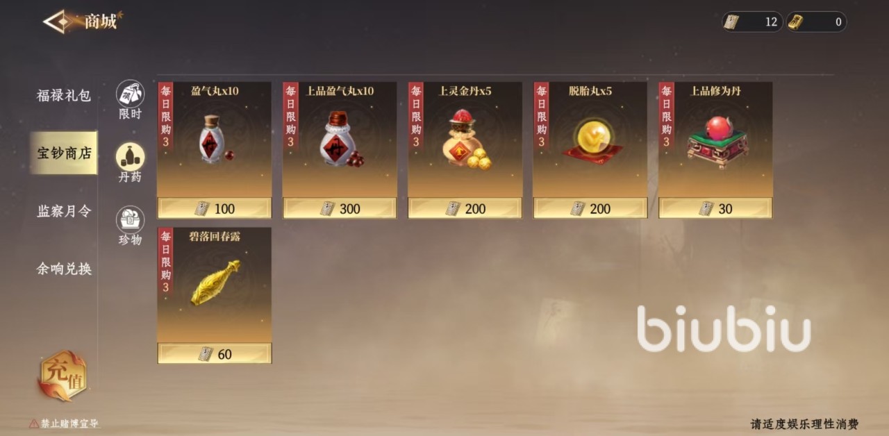 要想获得这些药品主要途径,包括自己动手炼制和商店购买这两类。先来看一下商城都可以买到哪些药品,打开商城之后选择宝钞商店,然后选择其中的丹药,就可以看到当前所能购买到的所有药品。主要包括盈气丸、灵金丹、脱胎丸、修为丹、碧落回春露等,这里能够买到的大多数都是属于品质比较高的类型,如果有多余的宝钞可以选择购买,用于提升战力。