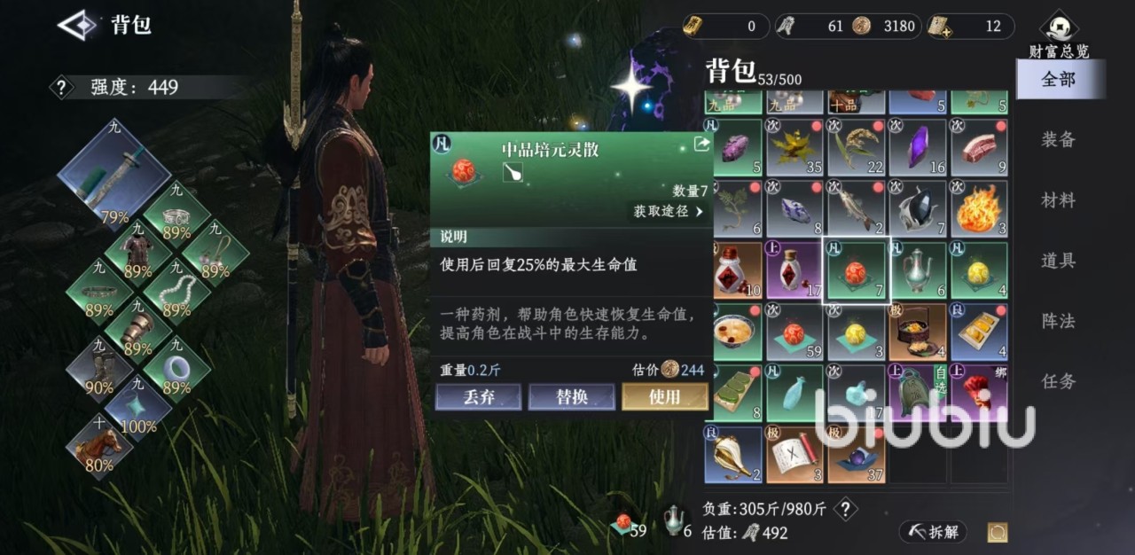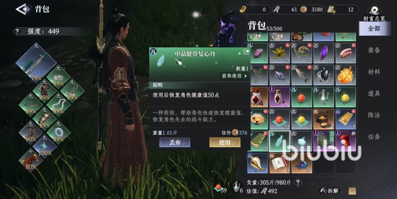 游戏中的药品有着多种分类,首先是最基础的一类,可以在战斗中恢复角色血量,这也是大家在游戏里最常用的,例如培元灵散等,品质越高恢复的也就越多。但还有其他的类型,例如健骨复心丹,使用后能够恢复角色健康值。回清露,使用之后能加速能量恢复速度。冲督脉丸,使用后可以加快体力恢复速度等,这些都是药品的重要组成部分。