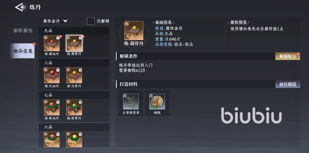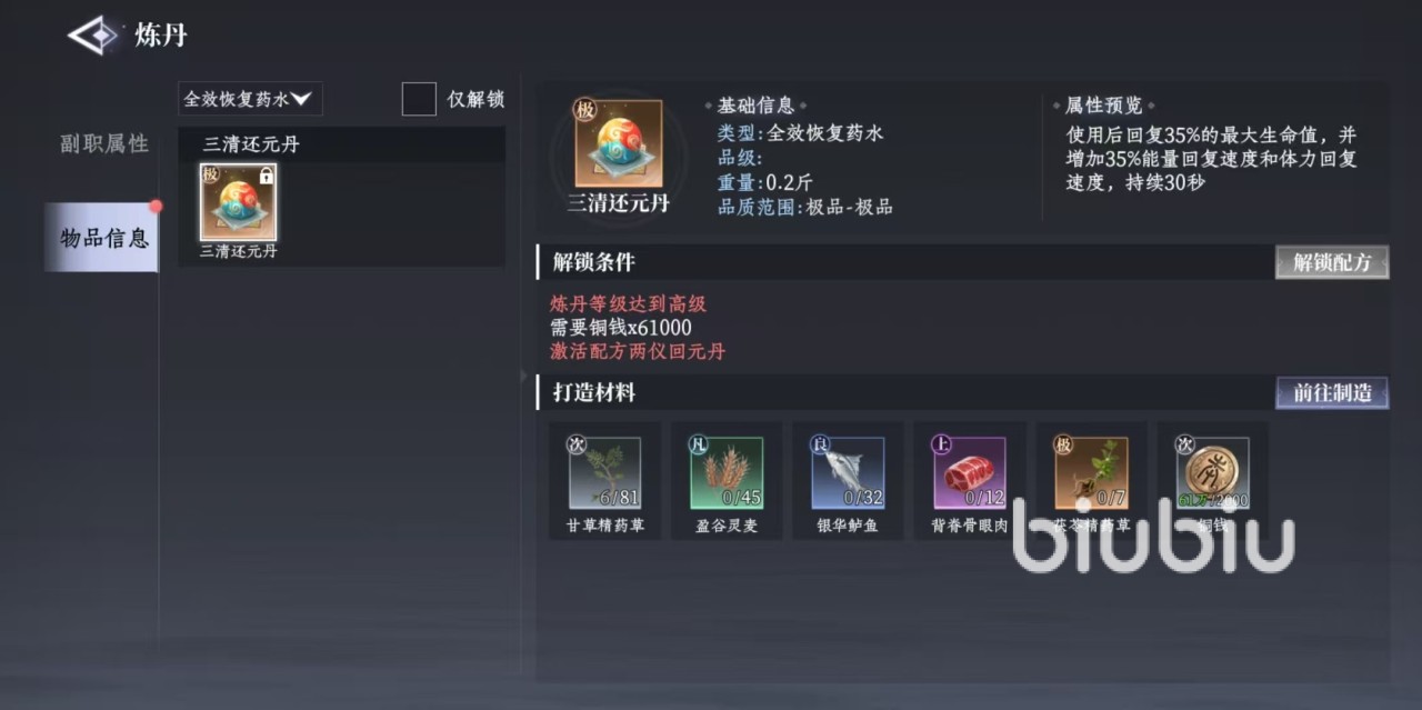 在介绍具体的炼丹产物之前,大家需要先了解该如何去炼丹。首先炼丹作为制造类型的副职业,不需要学习,一开始就处于入门的程度,这时只能炼制一些最低品级的丹药,通过不断的炼制积累经验后,可以提升到更高品质,解锁配方之后,就可以炼制更高品的丹药了。炼制需要的是各种药材和种植产物,这里以最简单的培元灵散作为介绍。