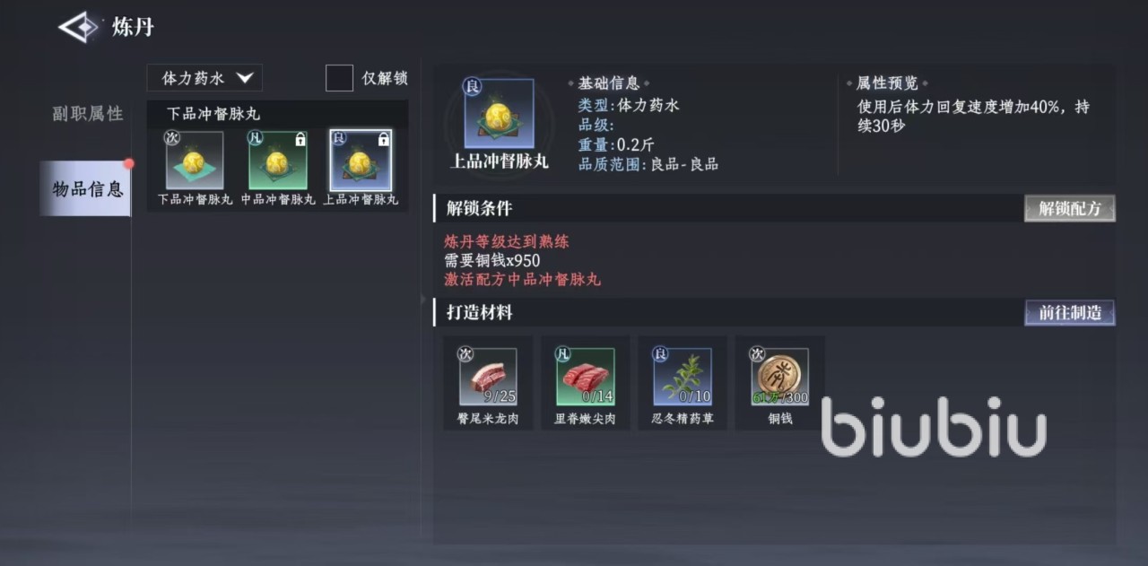 培元灵散的作用是在使用之后恢复最大生命值,其中上品培元灵散使用后可以恢复40%,是战斗中补充血量的绝佳道具。制作所需要的材料分别是金穗灵稻、盈谷灵麦、忍冬精药草和铜钱。这些就是通过采药和种植所收获到的产物,所以要想炼丹,一定要有大量的基础材料作为支撑,才能够培养起熟练度。集齐材料之后,只需要在任意城镇找到炼丹台,就可以自己动手炼制了,当然要保证有充足的精力。
