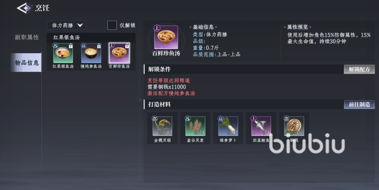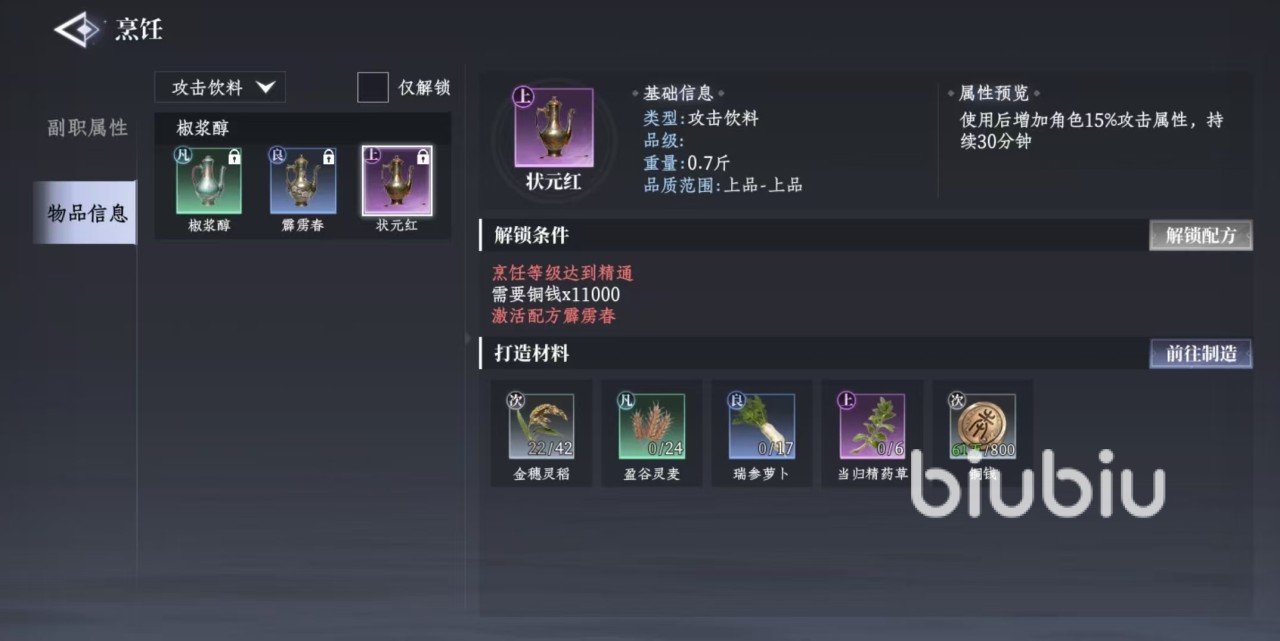 而且烹饪可以获取到的产物远不止状元红这一类,它主要包括四类,分别是精力、攻击、体力和全效这四大分类。不同分类中又有多个不同的品级,品级越高效果越好,消耗的材料也就越多越复杂。精力类烹饪主要的作用是在使用之后恢复角色的精力值,最差的是烤肉饭团,使用之后可以恢复角色5%的精力值,需要臀尾米龙肉和铜钱得到。品质最高的是八珍仙叶糕,需要金穗灵稻、盈谷灵麦、瑞参萝卜、坤玉白菜、背前上脑肉才可以制作出来。