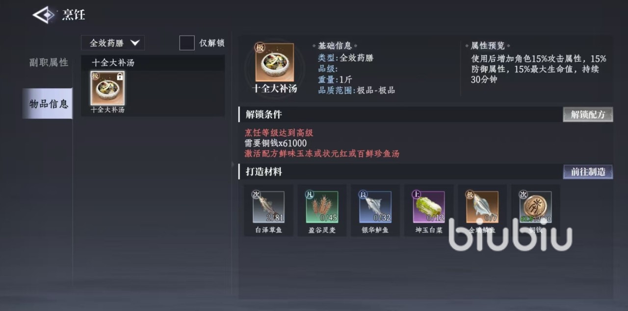 攻击类型的烹饪主要作用是使用之后,短时间内增加角色的攻击力。体力类的效果是使用之后短时间内增加角色防御属性,全效类型只有一种是十全大补汤,使用之后可以增加攻击、防御、最大生命值等三项属性。是目前最佳的烹饪类型,当然要求的材料也是最高的。