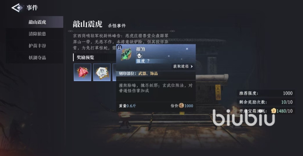 简单来说,刻印就是一项养成的功能,它所对应的资源是阵法。所以大家必须要清楚阵法如何获得。阵法主要是通过大地图上的事件来得到,其中最基础的几个包括敲山震虎、清除狼患、护苗丰谷和妖湖夺晶。这四大事件都可以掉落不同品级的阵法。例如敲山震虎,掉落的4个分别是蛮力、如虎添翼、穿云和摧煞。其中蛮力刻印的部位是武器和饰品,是属于朱雀位阵法,可提升攻击。如虎添翼属于白虎位阵法,能提升能量上限,穿云属于玄武位阵法,可提升远程伤害,摧煞属于玄武位阵法,提升的是对普通怪物的伤害。