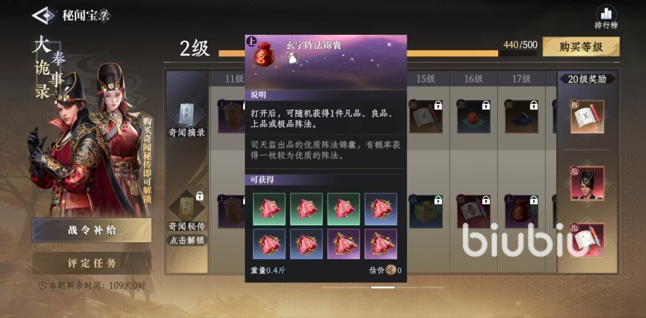 除了在这些事件中可以获得之外,还有一个途径是在百物通铺中,使用百物通券,也可以兑换到相应的阵法用于刻印。还有一个途径是在开服之后会开放相应的战令,在战令中也有对应的阵法奖励。例如在达到17级战令时,就会赠送玄字阵法锦囊,这里可以开启之后获得一些比较优质的阵法用于刻印。