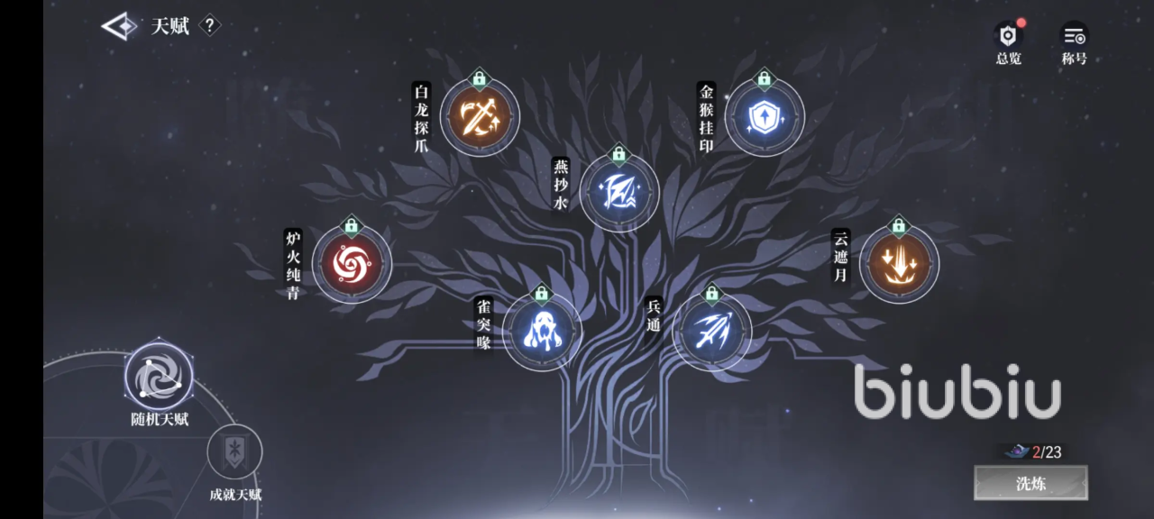 4、天赋:有随机天赋以及成就天赋的不同,这也是战力的重要来源,随机天赋有7个控,角色等级提升随之解锁,100级能解锁全部天赋控,天赋的品质是完全随机的跟装备颜色对应;成就天赋比较好理解,是完成特定的成就解锁的;可以使用天赋洗练丹来随机洗练天赋。