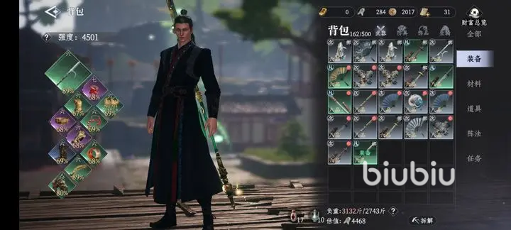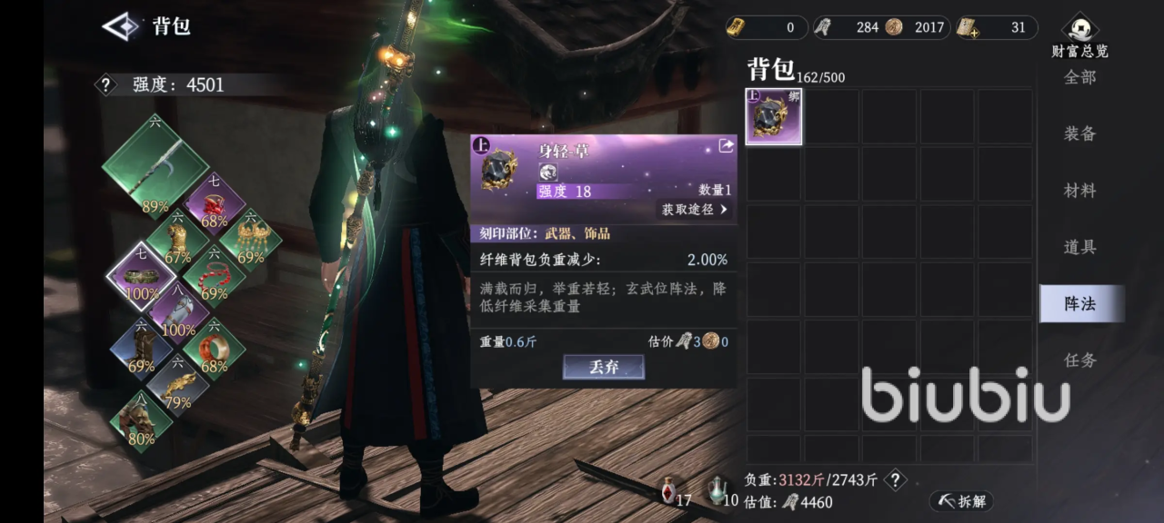 3、阵法:这是游戏内特有的系统,是镶嵌在装备上,用来提升属性的,不同品质的装备,能装配的阵法孔位区别较大,白色装备无法镶嵌阵法,绿色能镶嵌1个朱雀位的阵法,蓝色可镶嵌两个朱雀和白虎的阵法,紫色可以向前三个,朱雀,白虎,玄武,紫色品质以上能镶嵌4种阵法。