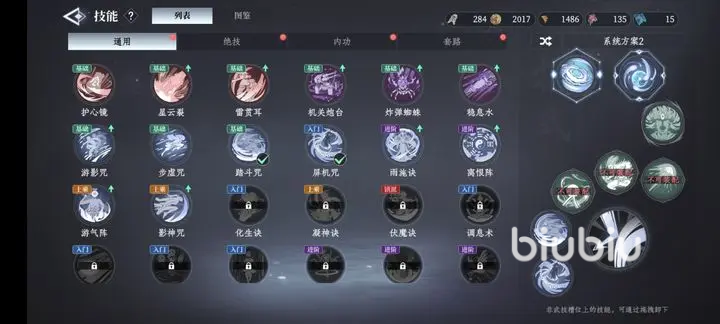 1、技能:技能分为几大类型,通用技能,绝技,也就是大招,需要怒气释放,内功,以及套路;按照从低到高,区分为入门,进阶,上乘,镇派,前四个技能可以理解为基础的过渡技能,镇派技能时后期构成BD的关键;不同的技能获取的方法和品阶,以及流派都是具有关联的;只有达到了某个固定的品阶,才能使用对应数量道具去学习。