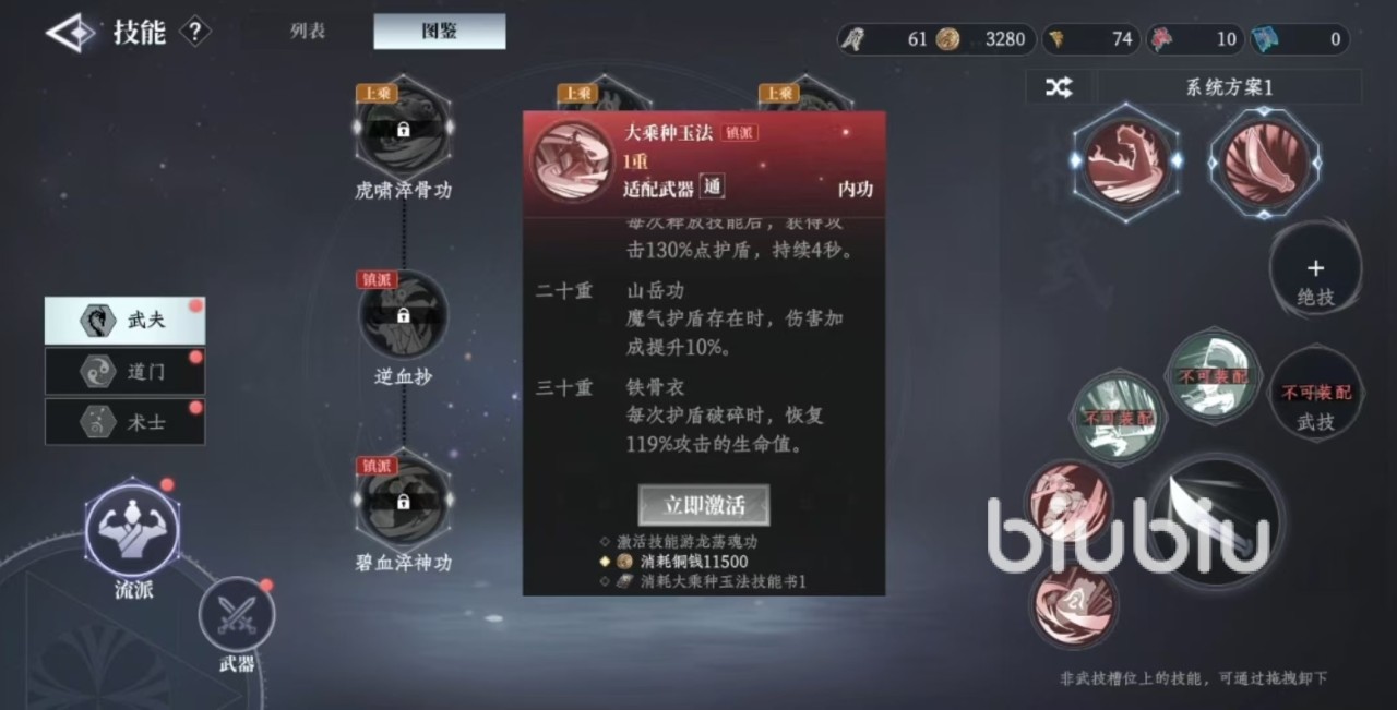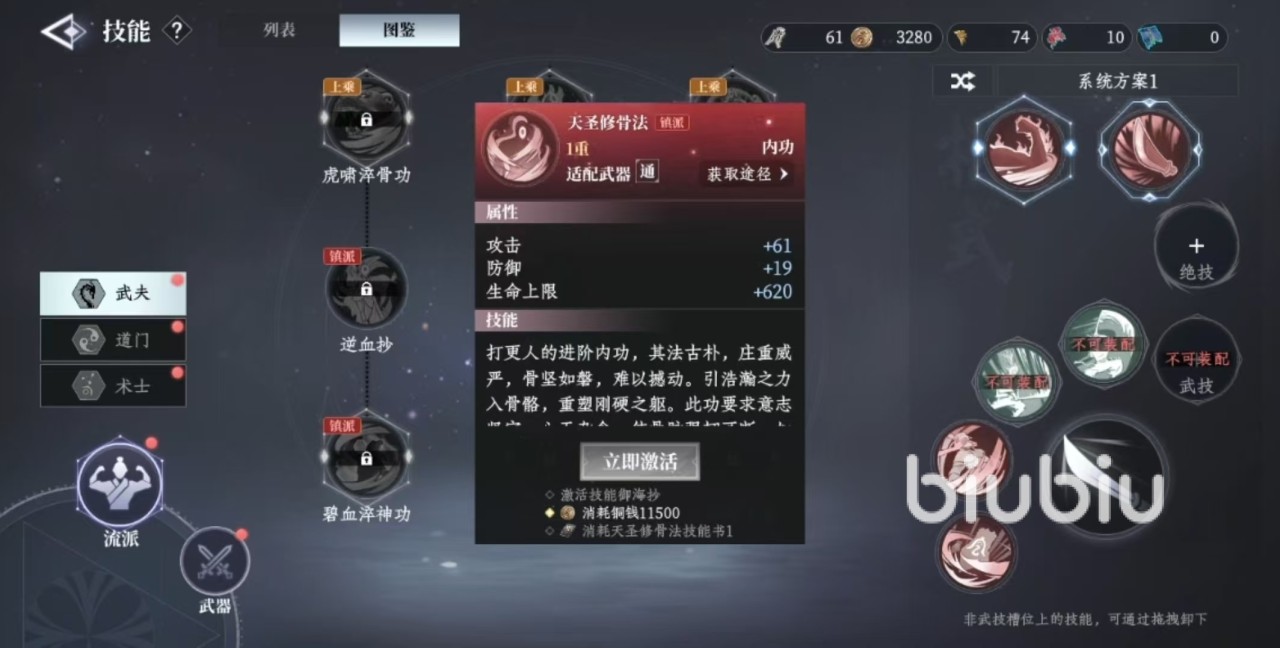 先来看一下大家最感兴趣的武夫流派,因为原著中许七安的缘故,所以大家更倾向于选择武夫,游戏中的武夫可以选择修炼内功有三种。天圣修骨法可以每秒恢复大量生命值,遭到致命伤害时使本次伤害无效。碧血淬神功,能够免除一次死亡效果,气血越低免受伤减免和伤害加成就越高。大乘种玉法,每次使用技能后可以获得高额护盾,护盾能够提供额外的伤害加成,破损后还会恢复生命值。武夫是游戏中战力非常强大的一种玩法,很适合新手玩家。