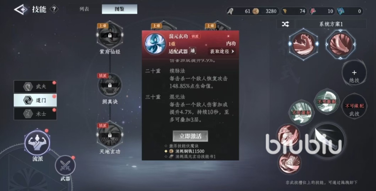 道门主修元神,通过领悟天地规则来掌控天地之力,擅长运用外物,道门体系相比于武夫来说更加丰富一些,既有攻击、防御,又有治疗、控制和辅助,底蕴非常深厚。道门的核心技能包括天地玄功,在释放技能时有几率恢复生命值,每释放一个技能就能获得伤害加成提升。混元玄功,每击杀一个敌人都可以恢复生命值,击杀一个敌人可叠加伤害,使得道门在战斗中非常适合清理小怪,越战越勇。上清仙经,战斗状态下,如果自身短时间内未受到伤害,造成的伤害加成、提升暴击提升。