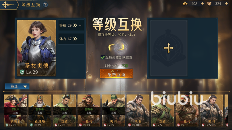 等级互换:获得新的英雄之后,可借此实现新英雄的快速升级;并不是所有英雄都能等级互换,互换后,等级经验都会置换,体力也互换,若等级高的英雄体力低,双方均衡继承体力值。如果角色在部队当中,双方还会交换位置;新手期是免费进行的,非新手时期,每周有50次的机会。