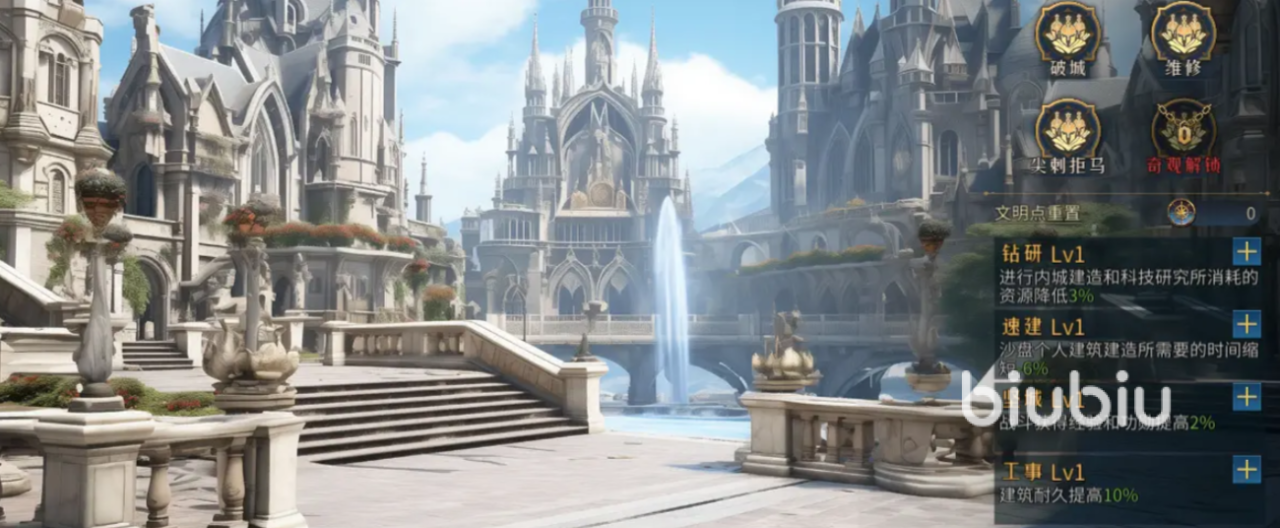 他的特性有钻研、速建、坚城和工事,钻研可以让内城建造和科技研究所消耗的资源下降3%,速建能让个人建筑建造时间缩短6%,坚城能让战斗得到的经验和功勋提升2%,工事可以让建筑耐久提升10%。