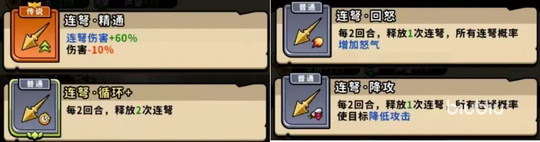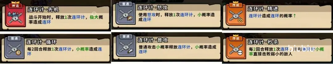 3、连弩;全能辅助的基色,这个计策大家肯定都不会感觉到陌生,每回合必定触发的机制,还附带了多样的buff,就成为了最好用的辅助计策,敌人减血,友方加血,加怒气,兼顾了续航和爆发能力,每一种buff都是对局中关键的因素,适合在BOSS战中反制,高难度副本中的容错也会得到提升。