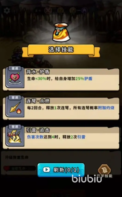 当三个刷新出的技能都是和概率相关时,可以选择刷新,也能直接选含有概率的,但是最好不要去选3次行动后会消失的技能,哪怕它的概率比较高,但由于还处于初期,只用来打小兵的话会非常影响我们过关。