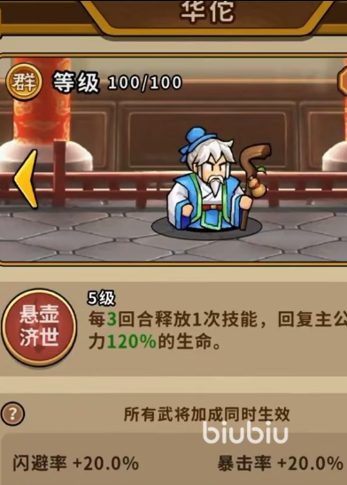 华佗:华佗会拥有一个加血的功能,而且在整个游戏的全局都会贯穿,始终实用性是比较出色的。在队伍中就可以带来持续生存的保障,因此这也是一个不应该忽视的选择。