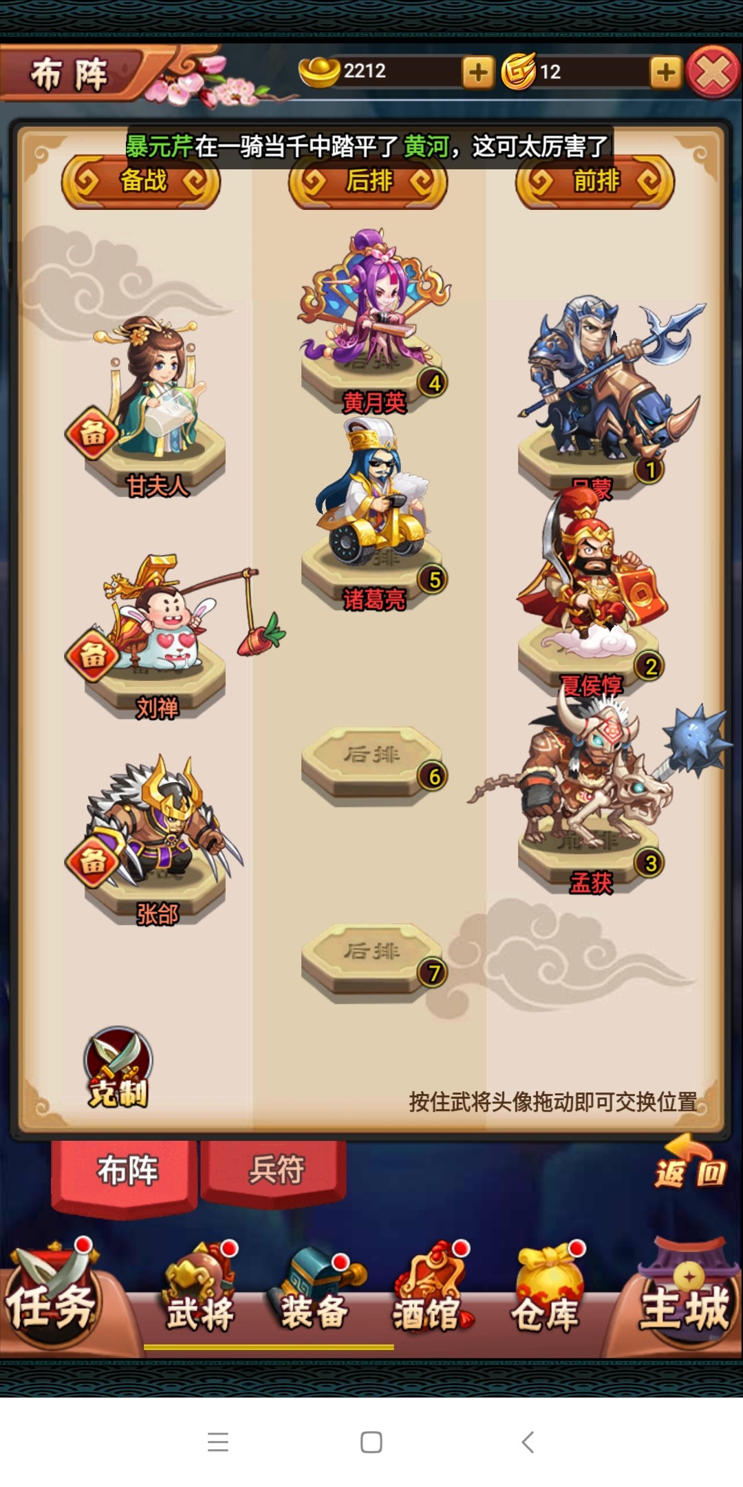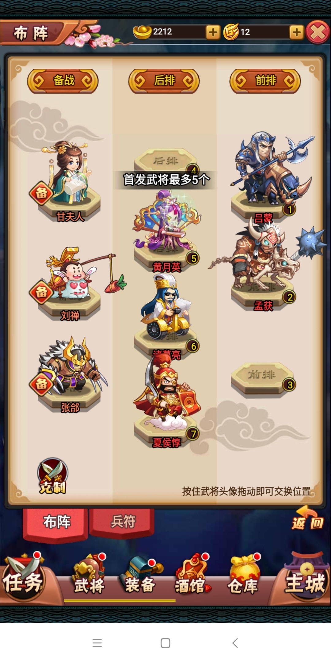 玩家可以在背包中决定哪名武将参战,然后在布阵中拖动头像即可调换武将位置哦!