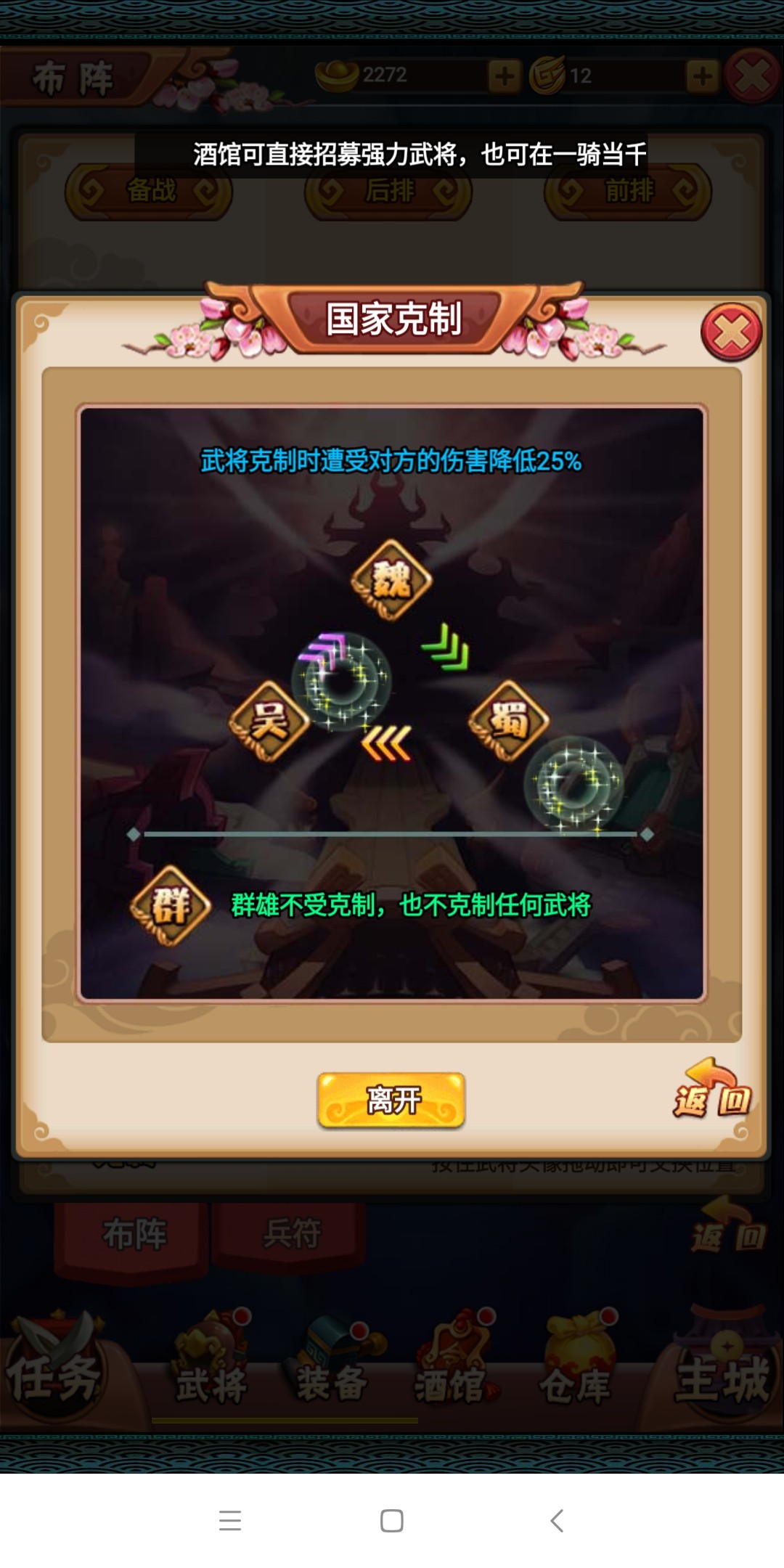 在布阵时还要考虑一个因素:国家克制,具体关系如下图,克制方受到被克制方的攻击时会降低25%的伤害。属于群雄的武将,如孟获、董卓没有羁绊关系,并且不受克制也不克制任何武将。如果玩家按照布阵规则还是挑战失败,那么就要调换被克制的武将啦!