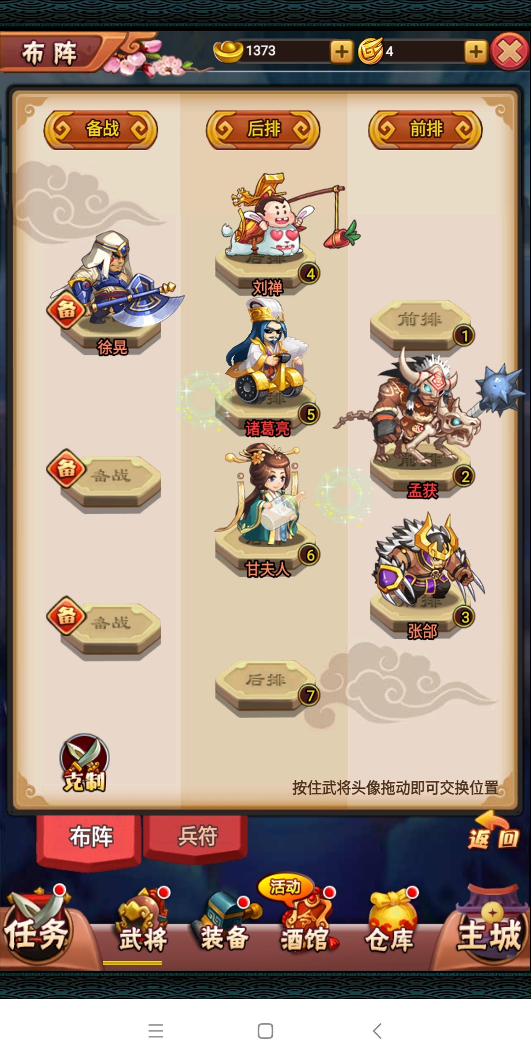 站位问题上选择诸葛亮、刘禅和甘夫人作为后排,其中诸葛亮布置在中间以在肉盾被击杀后承担伤害;孟获或张郃布置在前排中央,后援选择徐晃,可与张郃达成结义技能。该套阵容的输出核心是诸葛亮,因此最好为其配一套金色装备哦!