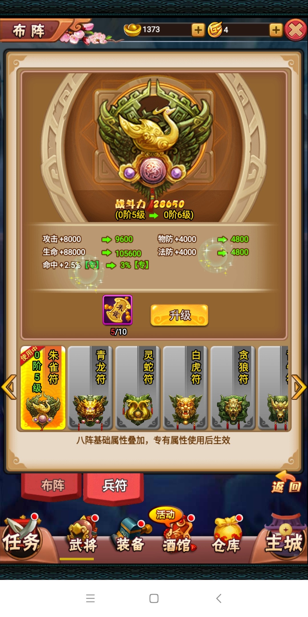 在蝙蝠选择方面,为了提高我方全体武将的命中率,可选择携带朱雀符,每次强化都能提高0.5%的命中率。由于兵符在升级后也会提供基础属性加成,因此,建议玩家积极参与押镖运粮玩法获得代币升级朱雀符。