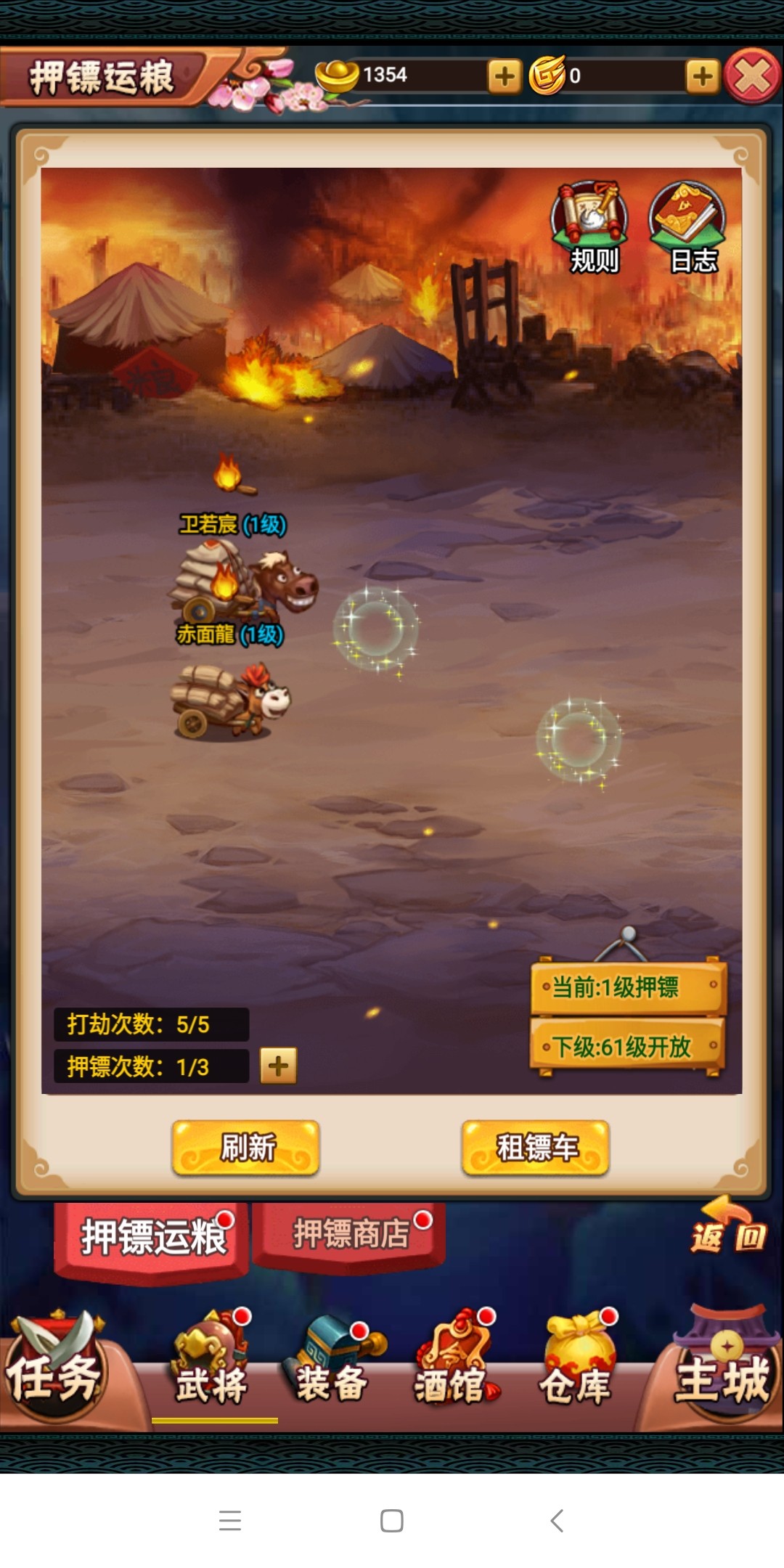 兵符的升级、进阶都需要消耗兵符书,而兵符书的重要来源就是押镖运粮。玩家每天可选择不同尺寸的货车运送粮食,计时10分钟,期间可掠夺其它玩家的货车最多5次。被掠夺的玩家将损失一部分镖银,所有货车只可被掠夺一次。