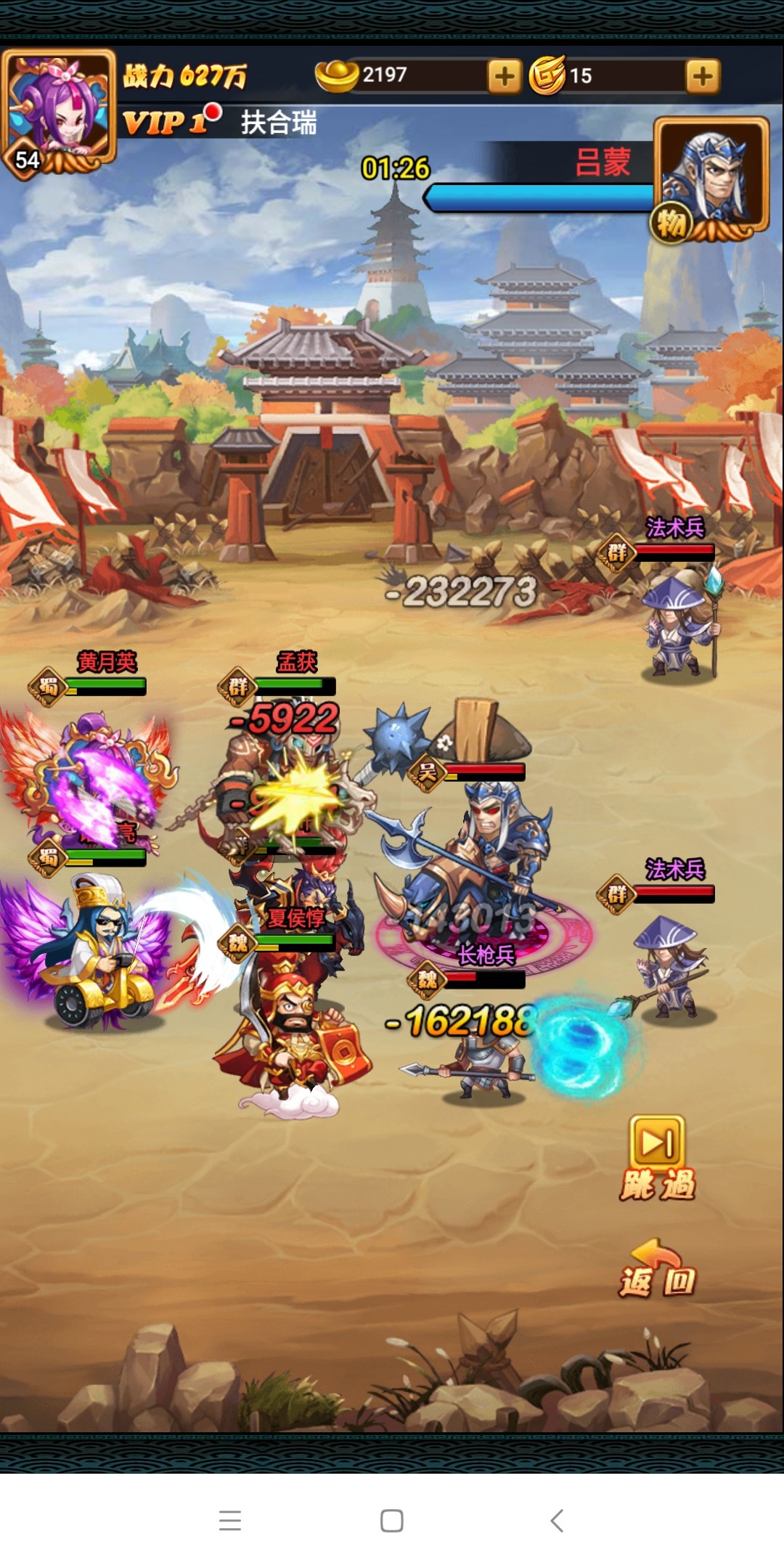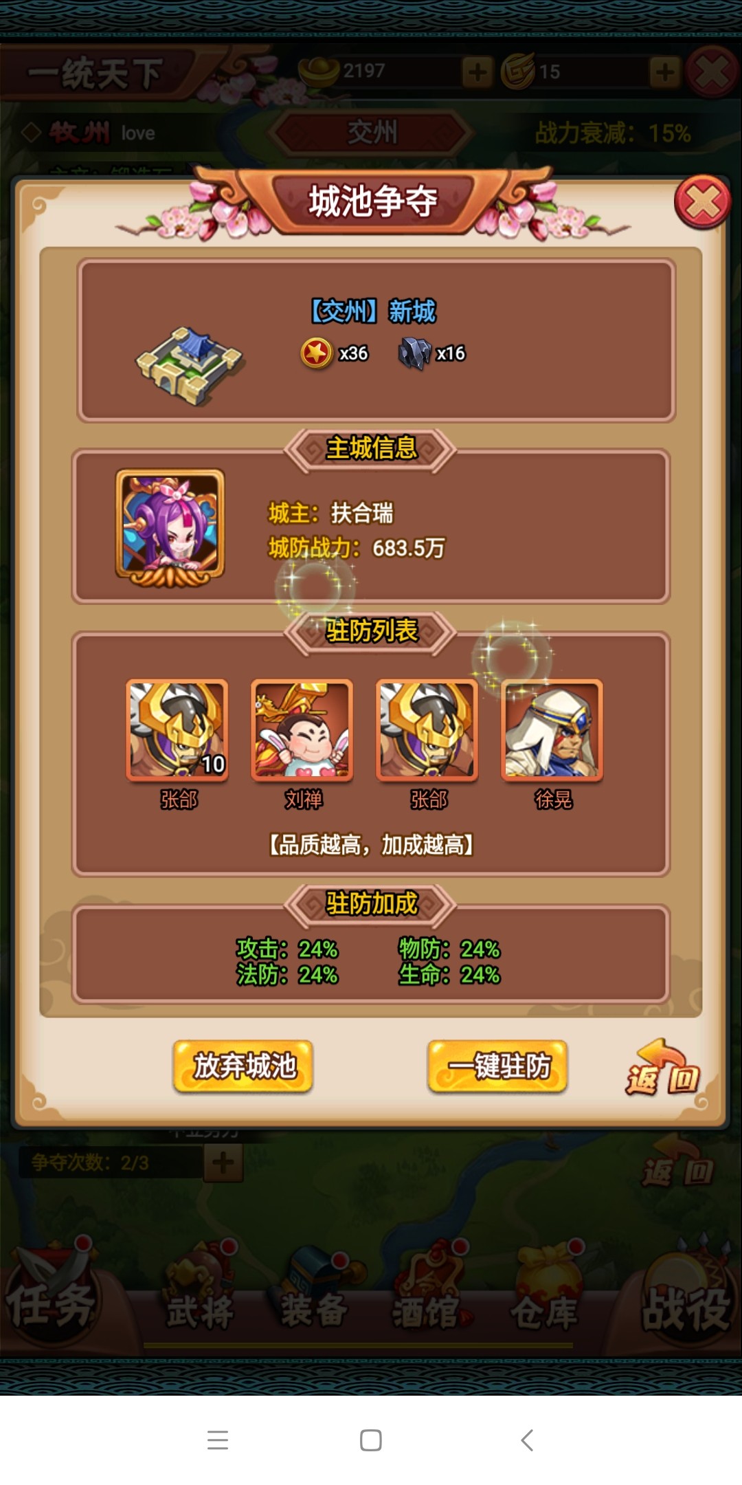 第二种情况,若都城守军是其他玩家,那么则需要针对敌方阵容选定战术。注意敌方守军的四围属性会得到百分比提高,而我方则会根据以占领都城出现战力衰减。玩家每天可免费进攻其它都城三次,之后就需要花费30元宝购买次数。