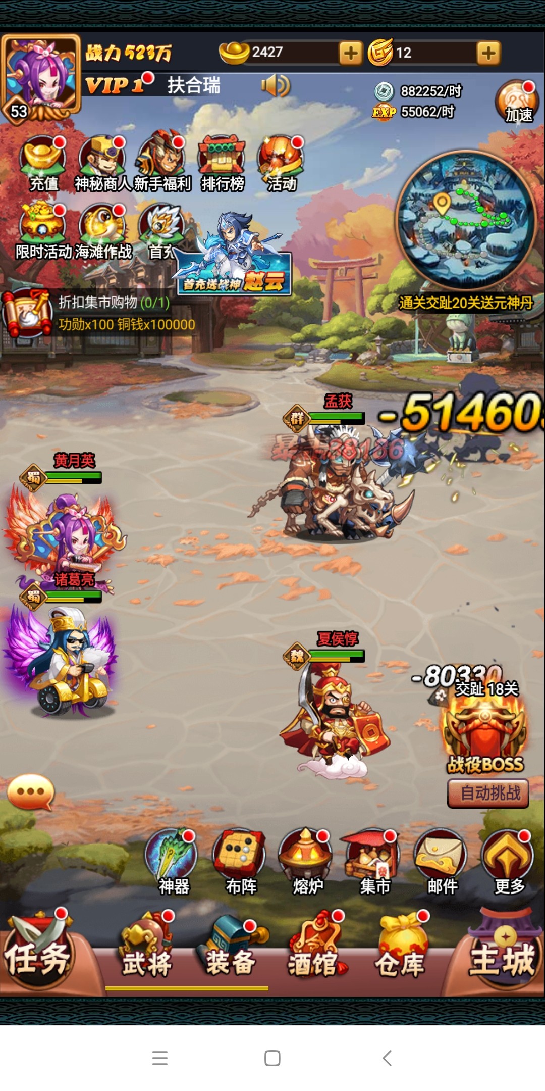 度过新手攻略后,玩家手中会有4个橙色武将和1个红色武将诸葛亮,建议前期把橙将培养到10级即可,用推图获得的元宝前往卡池抽红将。红将不仅伤害技能更加强力,而且本身远比橙将成长潜力大,因此建议优先培养。