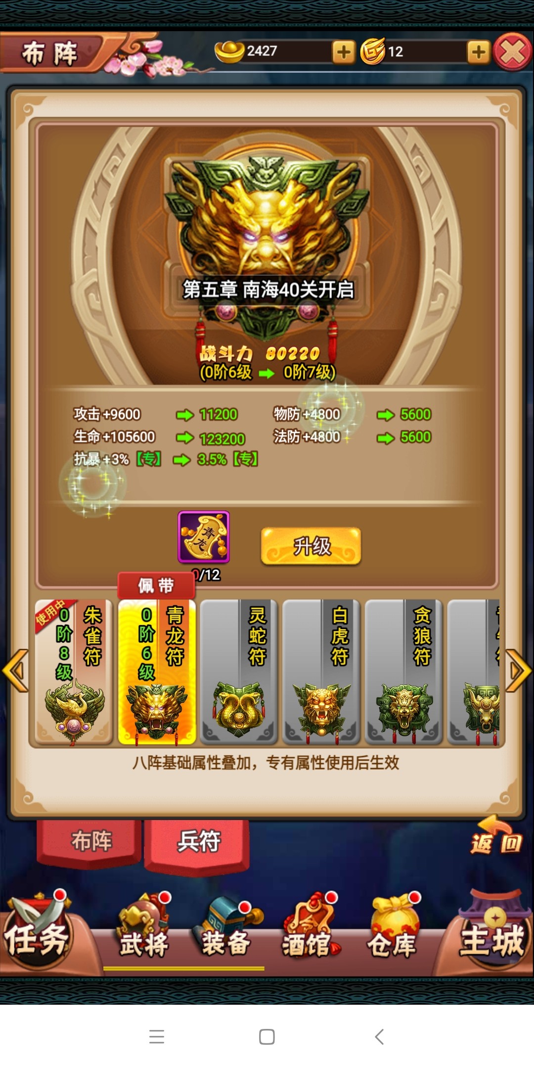 游戏中存在着朱雀、青龙、白虎、玄武等八种兵符,兵符的作用同样是增加四围属性,只不过每种兵符都有各自的专有属性加成,如朱雀对应的命中等。玩家可参与押镖运粮玩法获得兵符培养材料,新兵符随推图进度依次解锁。