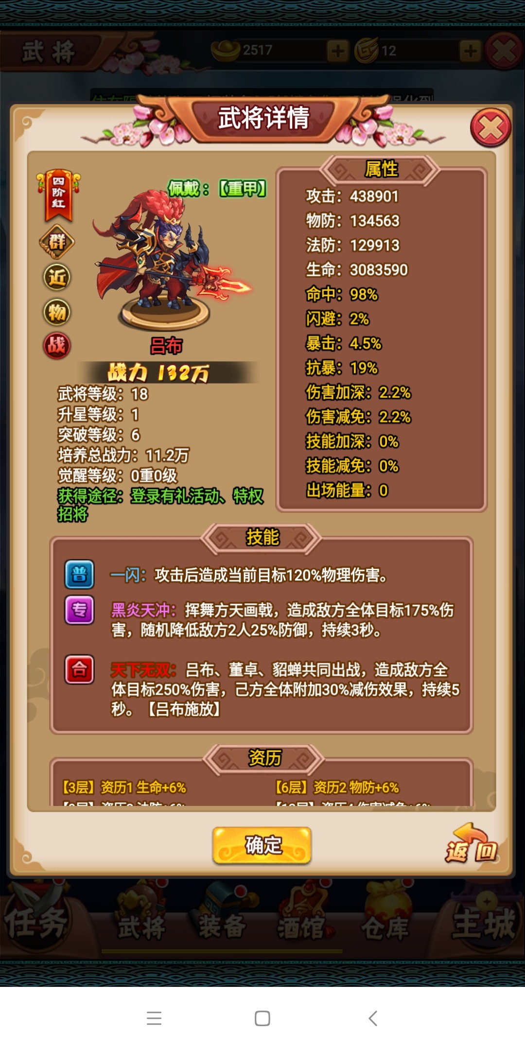 装备是衡量武将战斗力的重要标准,通常品质越高、阶数越多的装备越值得玩家培养,因为成长上限更高。小编举个例子:2阶武器红色百灵战斧,可强化至50级,锻造至30级,因此增加的属性远比低级装备多。