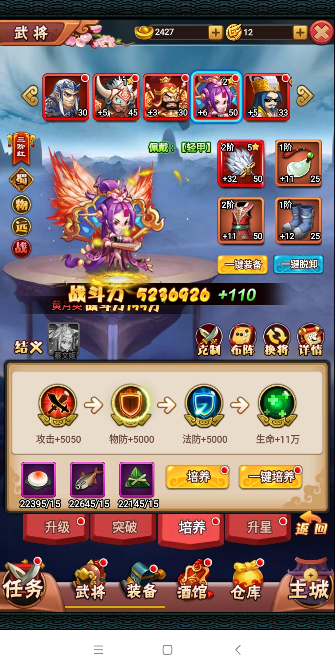 升级或培养武将都能提高攻击、生命、物防和法防四围属性,不过两者消耗的材料各不相同:前者主要通过挂机获得的经验来升级武将;后者则需要消耗御膳坊生产的食物培养武将。