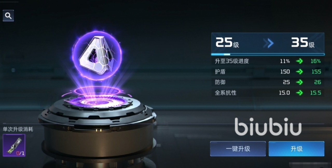 每次升级增加经验时,护盾的基础属性值会随着提升,且增加经验时有几率触发暴击。升级成功后,原护盾的品质、改装词条都会被保留。从15级开始每升10级均可消耗一定地图资源完成一次大的属性提升。