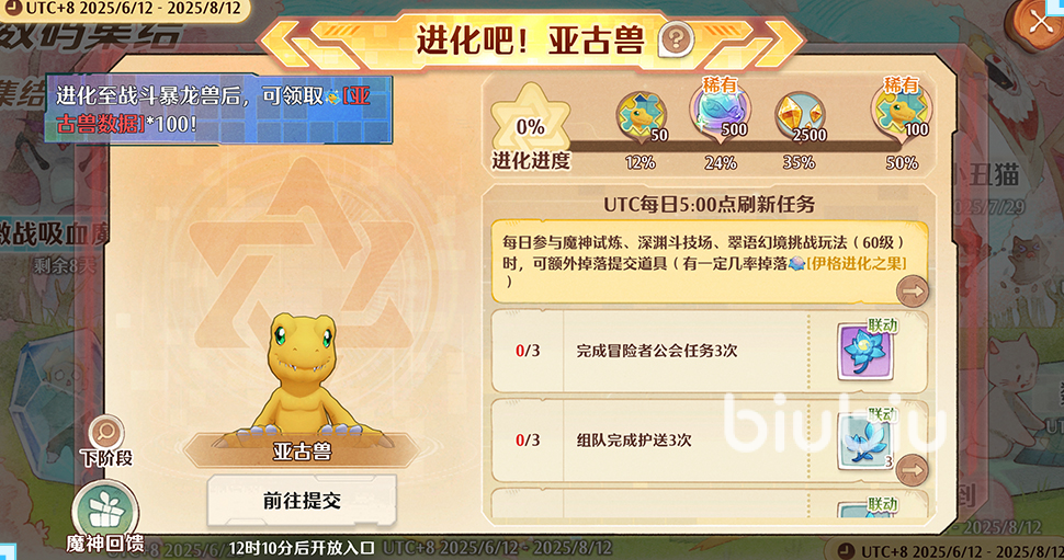 为了助力亚古兽向着进化,联动期间还开启了“进化吧,亚古兽”活动,每天做任务提交材料,全服累计进度领取联动家具、亚古兽因子、亚古兽数据等,就可以将亚古兽进化成红色品质的猫猫“战斗暴龙兽”了。