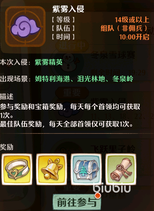 紫雾入侵这个活动会在玩家达到冬泉岭的时候开启,它每日的开放时间是从早上10点开始。在10点以后,玩家们在冬泉岭,泪光林地和海港的野外都会随机出现紫雾精英这种生物,玩家们需要将其击退才可以。