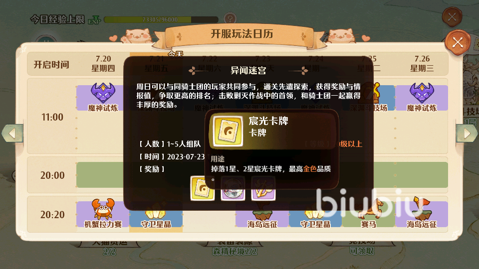 目前异闻迷宫的开放时间只能在上午11点,奖励是比较多样化的,可以帮助玩家们获取骑士团荣耀,还有艾斯喵喵的幻果,帮助玩家们掌握艾斯喵喵的能力,同时还包括一个宸光卡牌,让玩家们可以获取最高金色品质的卡牌,提升我们的基础战力,奖励来说还是很丰盛的,而且不需要玩家们付出多大的努力,即便是战力比较低,我们也是可以轻松参与这个玩法,获取更多奖励内容的。