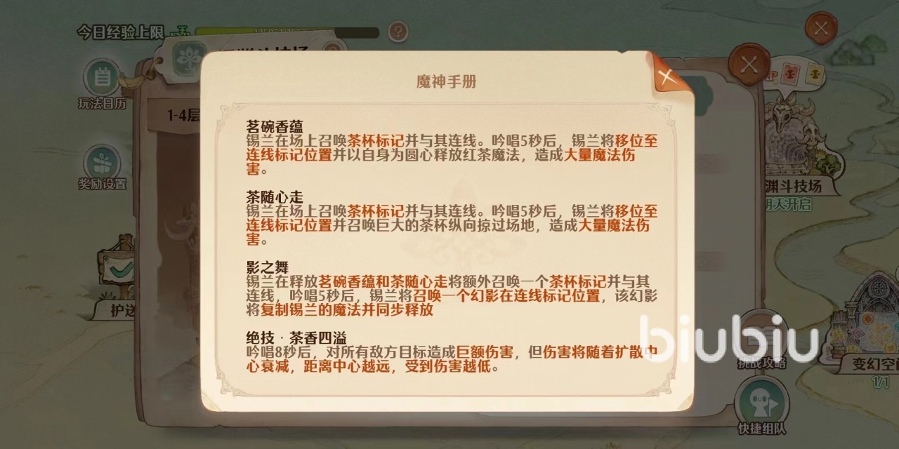 技能1“茶鼎添香”,这个技能针对的是仇恨值高的玩法,会给标记茶杯标记,然后给予大量的伤害;技能2和3都是会召唤茶杯形成连线,有5秒的打破时间,达到时间之后会和茶杯连线成功,在连线范围内的目标都会受到大量的魔法伤害。