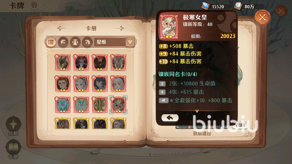 后期最高可以累积增加508的暴击伤害以及84点攻击伤害属性,最多在这里可以镶嵌四张同名卡,两张的时候可以累积增加1万以上的生命值,四张可以增加615的暴击效果,如果全套都能强化到十级以上,那么我们还可以额外增加800点暴击,这也是目前游戏内暴击属性值最高的卡牌了,可以帮助我们提升战力上限。