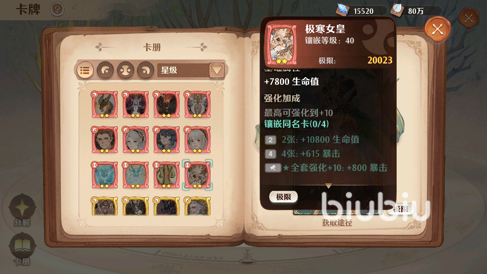 极寒女皇在获取之后,我们就可以轻松进行养成了,它的基础属性比较高,最多可以为我们叠加7800以上的生命值加成,玩家们可以对卡牌进行强化,最多可以强化到10级以上,强化一级的时候,我们可以累积叠加1088的生命值,等到强化达到三级以上,那么我们就可以叠加额外的暴击属性加成了,这个也是非常关键的,要知道在战斗的时候,暴击属性越高,我们可以攻击出来的伤害数值就会越强。