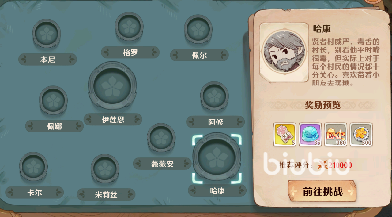 这里玩家依旧是需要去挑战npc,其中村长哈康战力最高,击败以后的奖励也是不错的,不过想要成功打败他,那么玩家的战力至少也得突破到21万,建议大家在此阶段把战力提升的重心可放在装备方面。