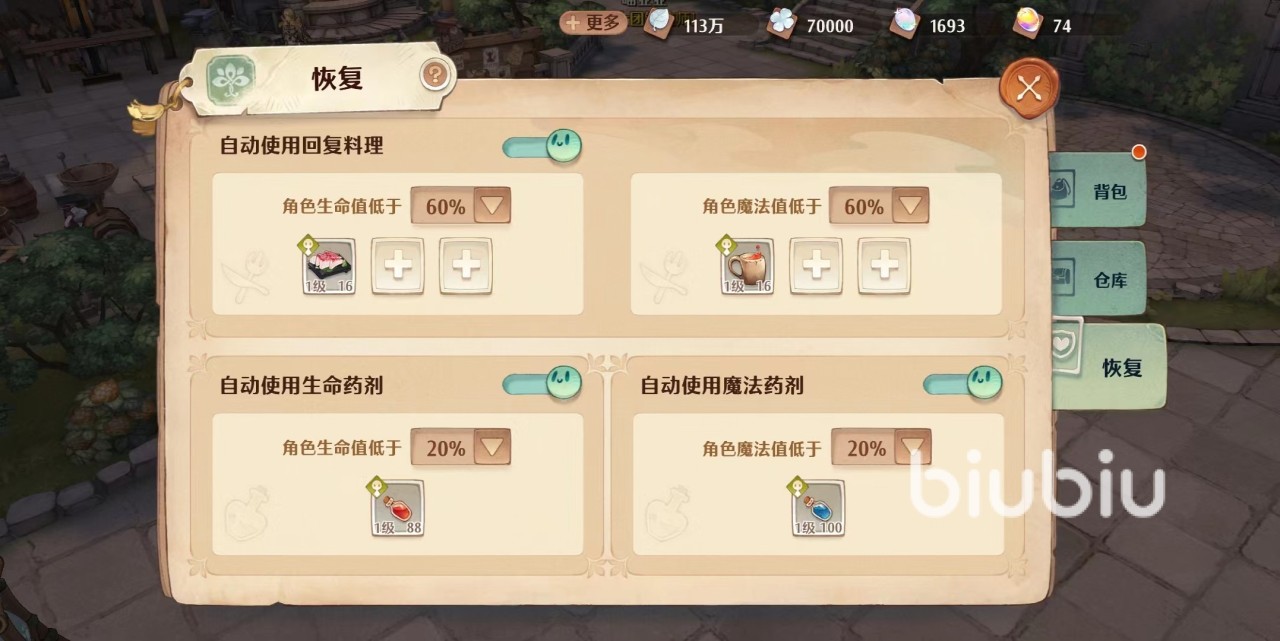 点开游戏页面的背包页面就看看到关于恢复的设置,玩家可以自己设置在生命值达到多少或者是魔法值低于多少的进行恢复,具体的设置和玩家恢复道具的等级有关,等级越低,设定的阈值就要高一些。建议20级的道具在低于50%到时候设置,30级可以在30%左右的时候进行使用,40级的话可以在20%的进行设置,等级越高的恢复道具恢复的效果越好,每次使用之后有60秒的冷却时间,建议带等级高的恢复道具。