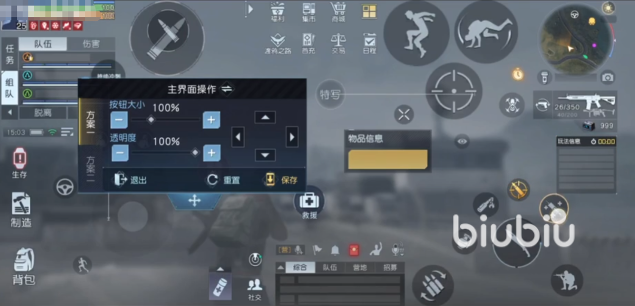 1、左边区域:首先大家先从左边开始进行设置,左边的这个玩法信息是没有用的,大家先给他放到一边去就行了。然后把射击按键全部给他拖到血条的右边位置。在完成上述操作后,将左下角这边的这个配方和背包给它放大一点点,方便开启使用。同样生存辅助仪和方向盘也给他放大。最后把召唤载具的按键给他拖到左边配方的旁边去,这样左边就已经设置完成了。