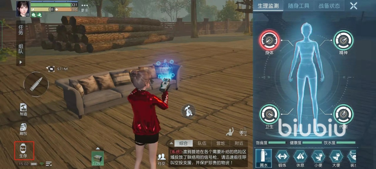 具体到每个数值的话,就对应到游戏里的具体互动玩法了。比如喝水,游戏里你可以在地图上有水的地方进行装水的动作,然后饮用,但也不是所有地方的水都能喝,如果是少数不干净的水源,可能会导致疾病和代谢出问题,这就需要靠排泄以及恢复正常作息。