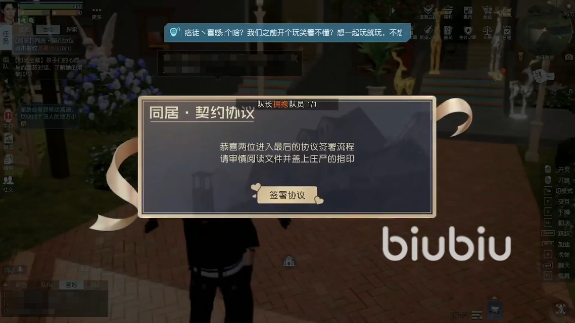 1、想要进行同居的话,那么首先两个人就要先进行组队,然后一起来到对方的庄园里面。在这里可以发起一个同居申请,在顺利答完系统预设的十道题之后,还要再进行一个拥抱。完成上述的操作之后,就可以签署一个同居协议了。