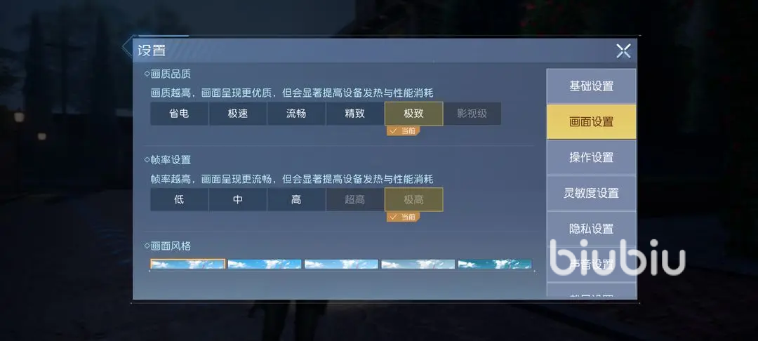 1、设置功能中的“基础设置”就是用于调整画质的,不过目前该游戏已经锁帧30针了,因此是无法在手机上体验到最高画质的。其他的设置风格就看大家自己的喜好的,比如画风风格之类的。
