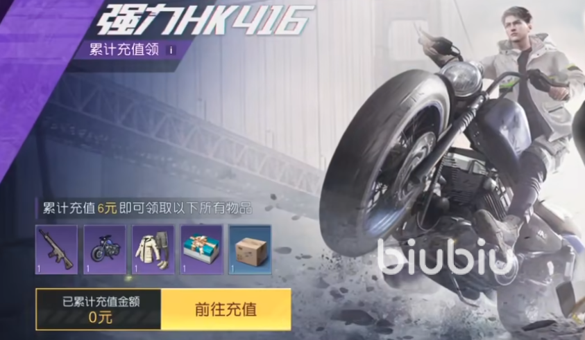 1、首冲的礼包主要分为了五种,分别是时装荒野行者、载具皮肤、紫色武器hK416、绷带、努力生存礼包。