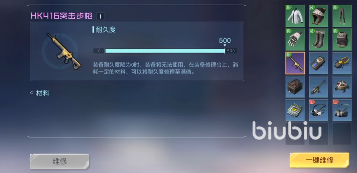3、礼包的自身武器hk416,前期打一打小怪还是非常好用的。而且它这个不是a版武器哦,它这个武器在用坏了后是可以维修的。